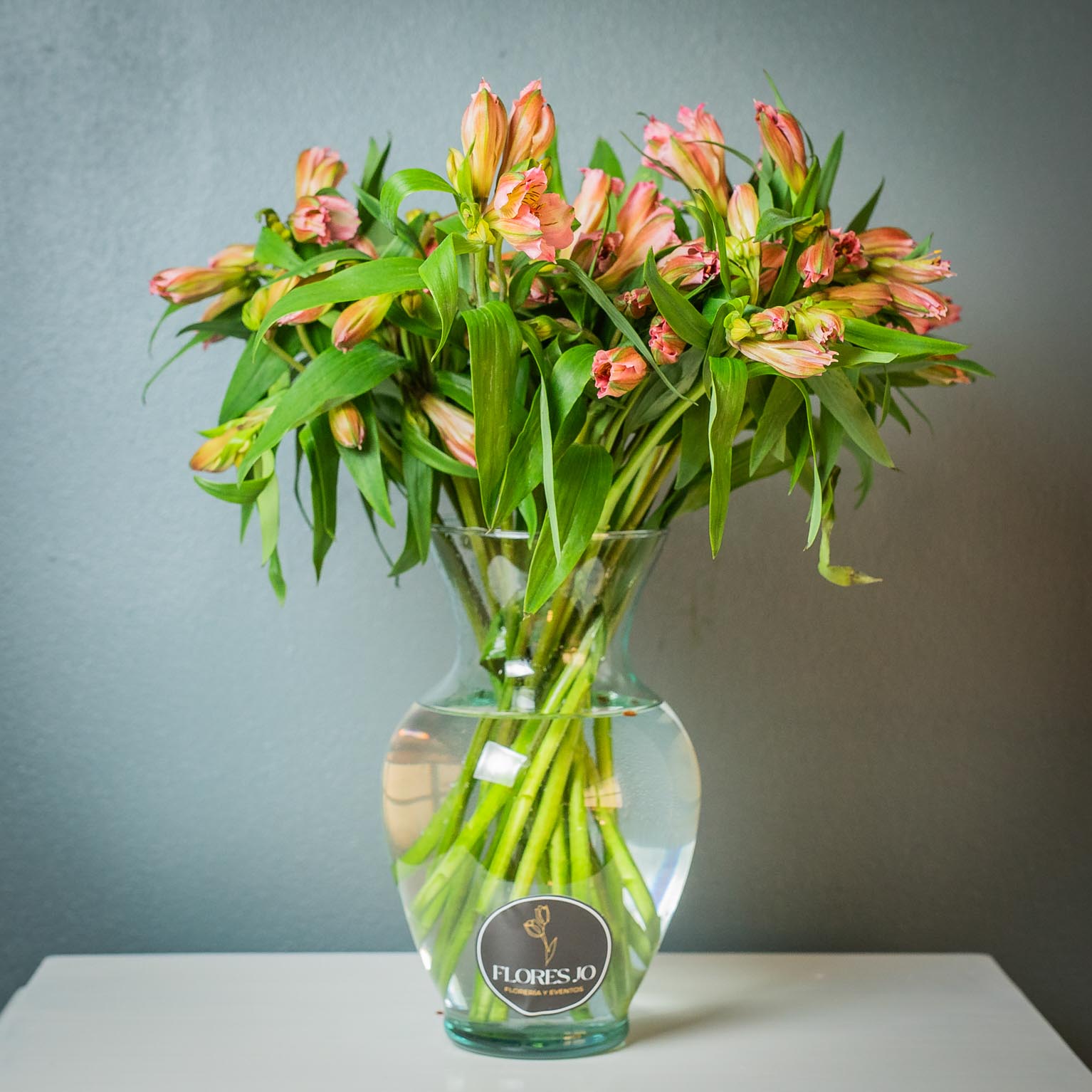 Florero vidrio con alstroemerias, 20 unidades